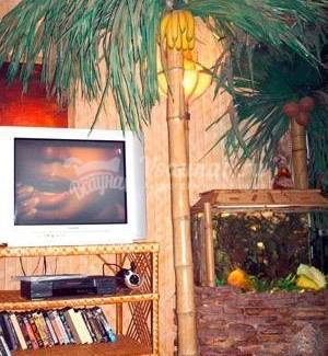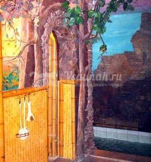Стоимость: 150 грн/час, свыше 5-ти часов скида 10%. Вместимость до 10 человек. У бассейна подогрев до 28°С с водопадом и системой отчистки воды. Глубина бассейна 1.80 м, размер ее 2х5. 2 комнаты отдыха с африканским стилем. Комнаты отдыха оборудованы TV, караоке.